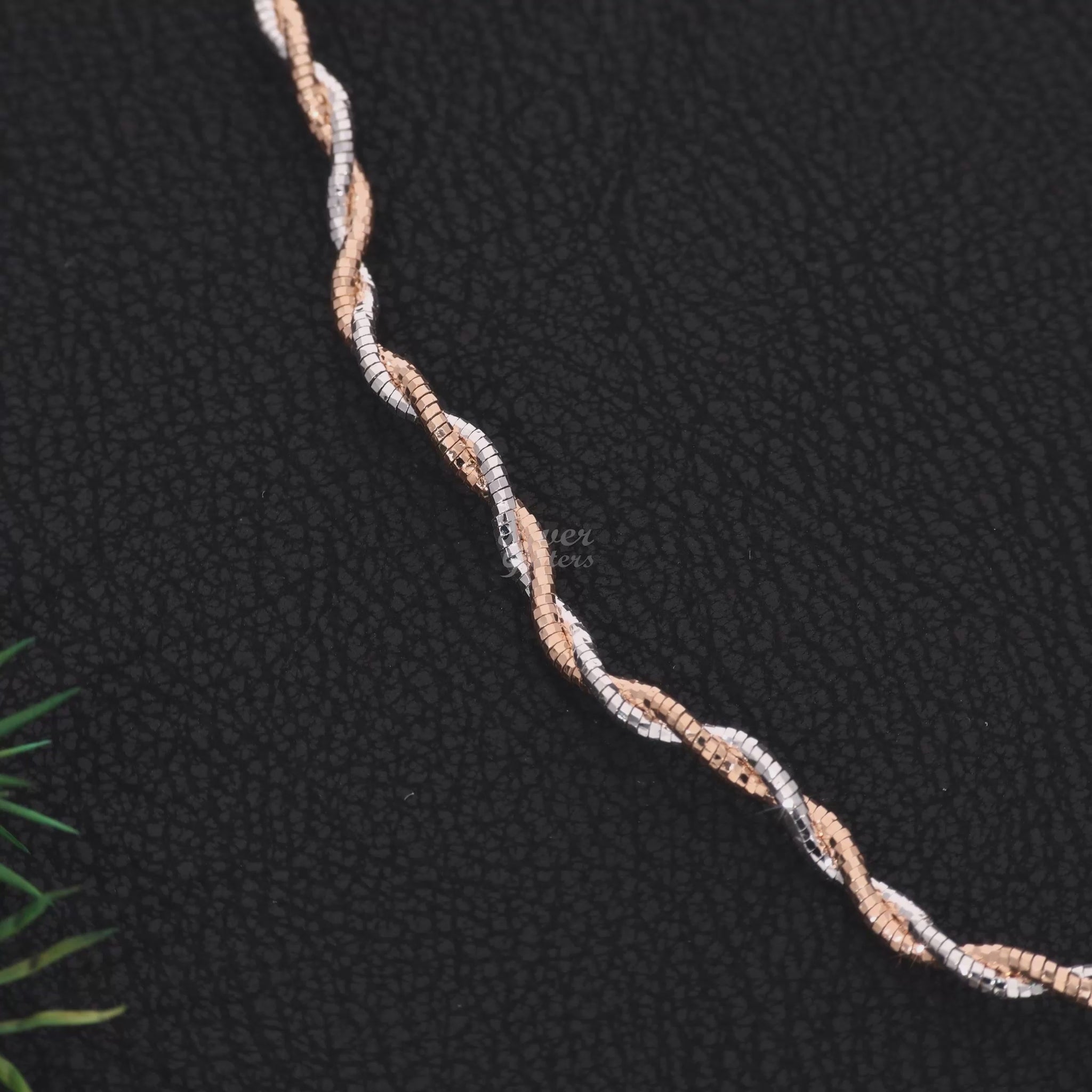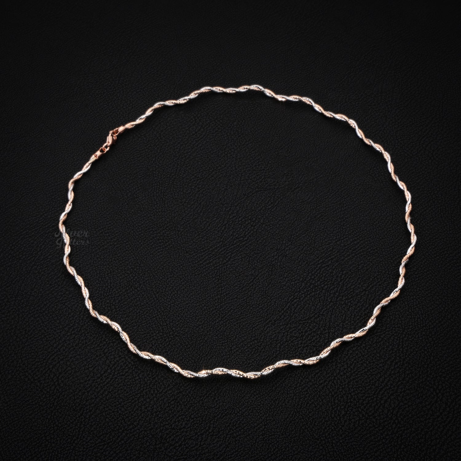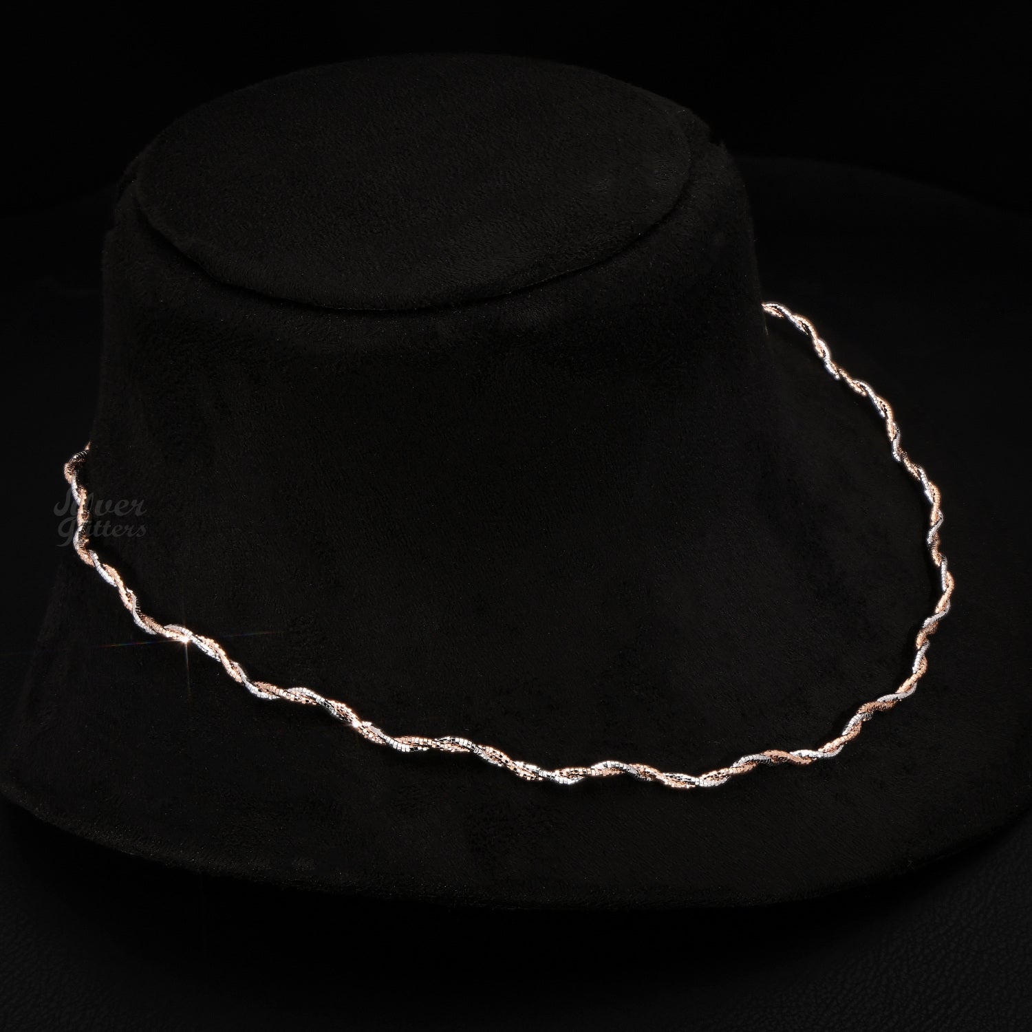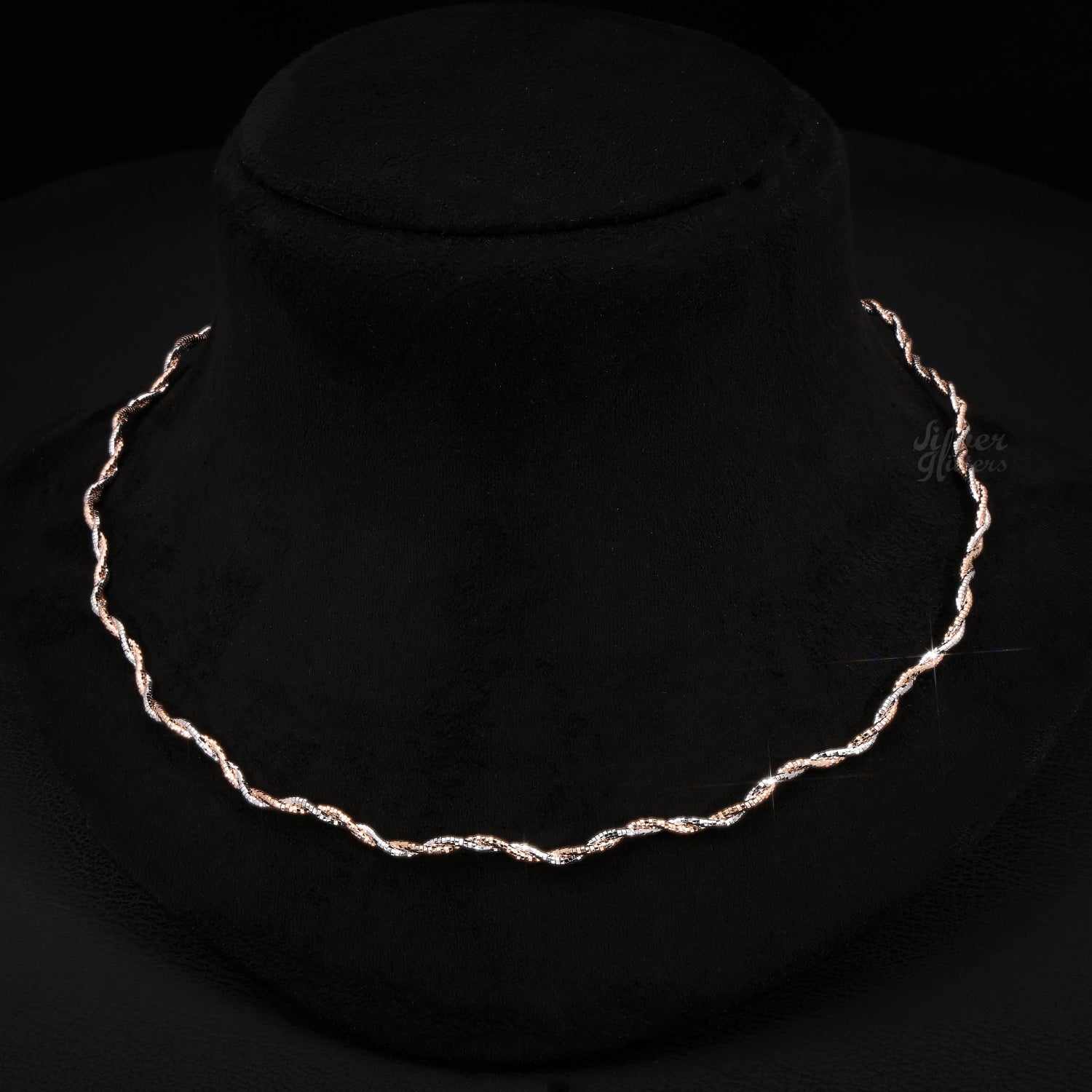 Expertly crafted with 92.5% sterling silver.this diamond cut TWO-color braided necklace features a unique combination of rose gold and silver.The intricate braided design adds a touch of elegance to any outfit, making it a versatile and stylish accessory for any occasion.