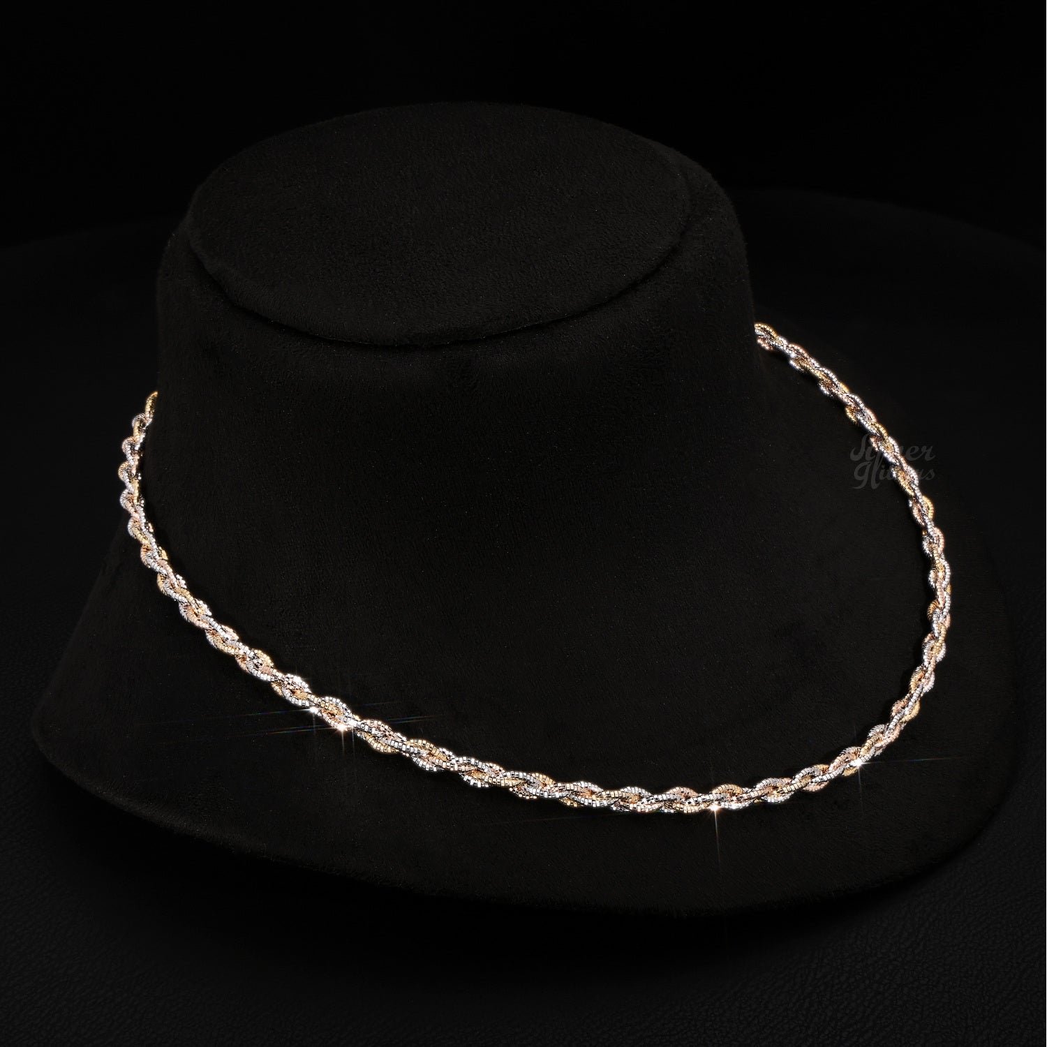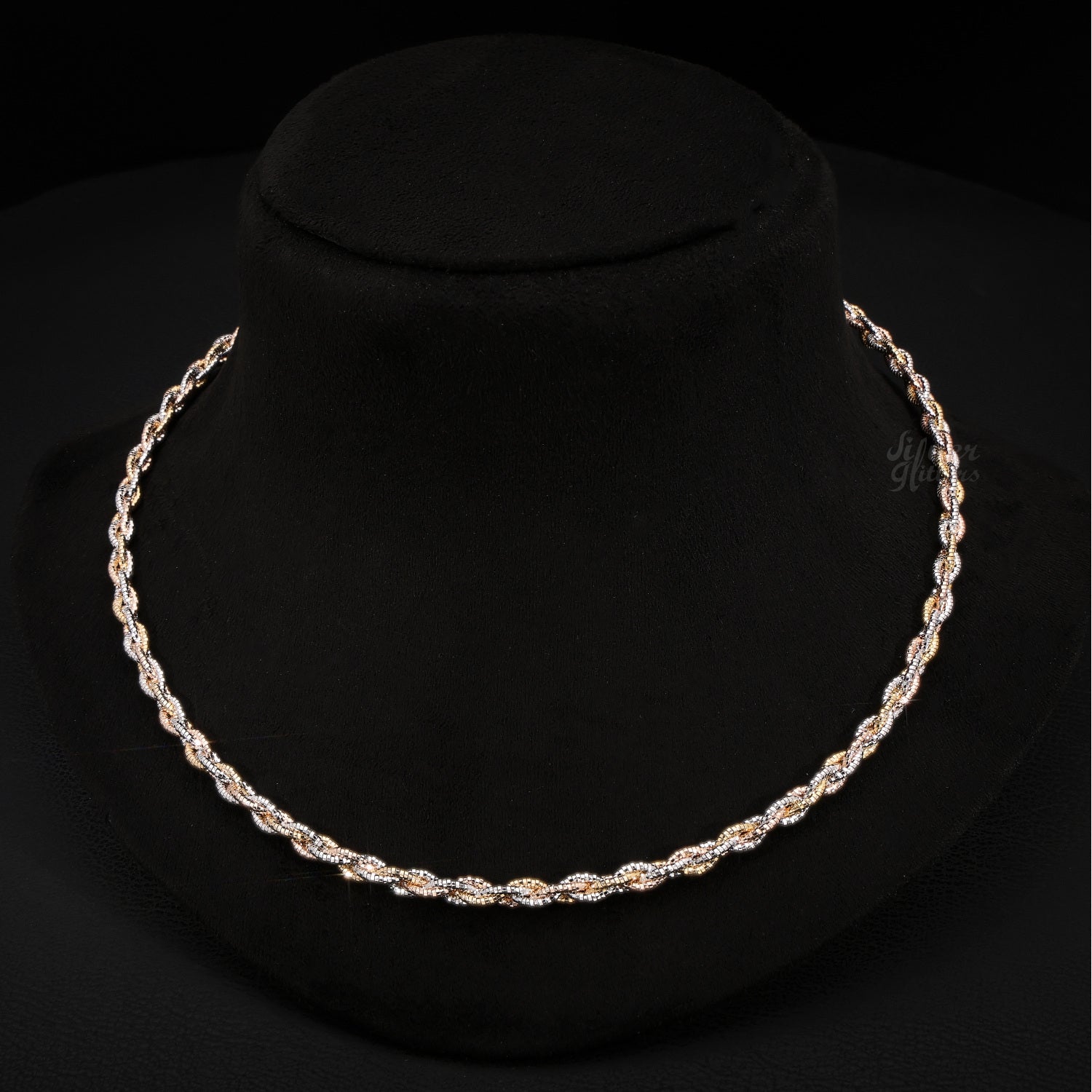 Expertly crafted with 92.5% sterling silver, this diamond cut tri-color braided necklace features a unique combination of rose gold, silver, and gold colors. The intricate braided design adds a touch of elegance to any outfit, making it a versatile and stylish accessory for any occasion.